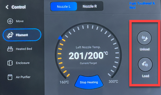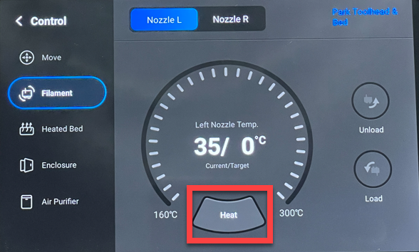 Before you can load or unload you need to select the Heat button at the bottom of the screen as shown to bring that nozzle to operating temperature. Until you do the Unload and Load buttons on the right will remain greyed out and unavailable.